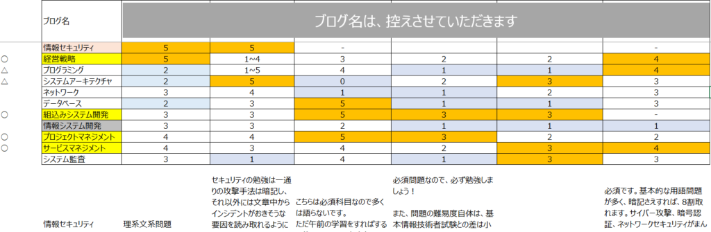 | ステップ① | 応用情報技術者試験の合格者のブログを複数検索し、表にまとめた (特に、ブログの著者の知識レベルや経験が自分に近い方の意見を参考にした) |